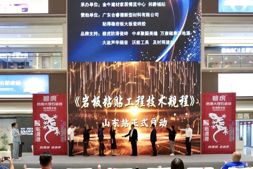 On the morning of May 8, sponsored by China Ceramic Industry Association Ceramic Tile Pasting Technology Professional Committee and Shandong Decoration Association, hosted by Jinniu Building Materials Home Expo Center and Bangjue Paving, and co-organized by Guangdong Heruide New Materials Co., Ltd. and Paving Steady Rock Plate Large Plate Ceramic Tile Glue, Shandong's First Rock Plate Paving Technology Exchange Conference and the first publicity of "Rock Plate Pasting Engineering Technical Regulations" was held in Jinniu Building Materials at Jinniu Global Home.